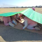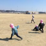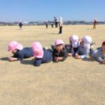 芝生に寝っ転がったり、座ったりして輪っかを取る。桃組のお友だちは初めての遊び。子どもたちからも「楽しい」「また、やりたい。」とすごく人気でした!