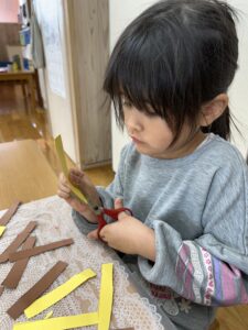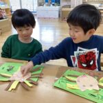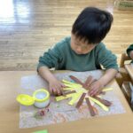 自分のものが完成すると「できた!」と満足して終える子が多かった製作ですが、友だちの作るものにも興味を持ち、作り終わった後も席に残り友だちが作る様子を見ている姿があり、関心の広がりが感じられます😊