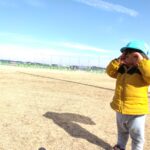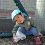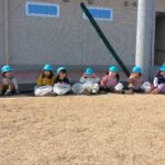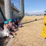 スポレクパークのフェンス沿いに3人のお友だちが並んで座っていました