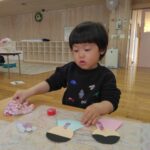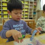 以前にもハサミは使用したことがありました。しかし、ハサミを上手く開閉する事が苦手で、1回切りが難しい子が多かったのですが、1回切りが出来るようなっている!また、上手な子は連続切りも出来ていました。