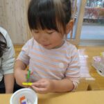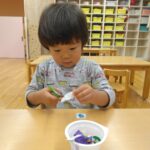 ハサミで折り紙を切りましたが、一回切りがすごく上手で、手先をよく見てたくさん切りました!