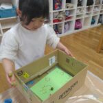 箱の中に画用紙を入れて、その上に絵の具をつけたビー玉を転がしてみました。
