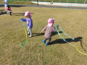 公園に着くと気持ちの良い風がピューっと吹き、大きな木から葉っぱがサラサラサラ~と降る度に、子ども達は声をあげ喜んでいました🍂🍂🍂