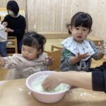 始めはサラサラふわふわの感触でしたが、水を入れるとペッタリと手に付き、少し苦手な子もいました。