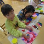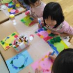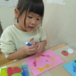 先日スタンピングで型取りした画用紙の中心に好きなものをかいていいよと伝えました。