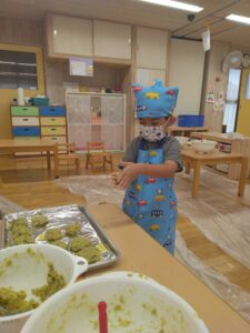 「部」という事をよく知ってるな~と感心しながら、保育者も見様見真似でフープに全力で取り組んでいると・・・