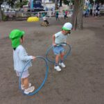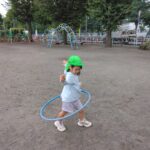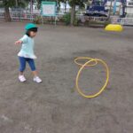 と思いながら一緒に遊んでいると「私たちフラフープ部だからね!」と言って、フープを転がしたり腰で回そうとしたりして、技のようなことを始めました。
